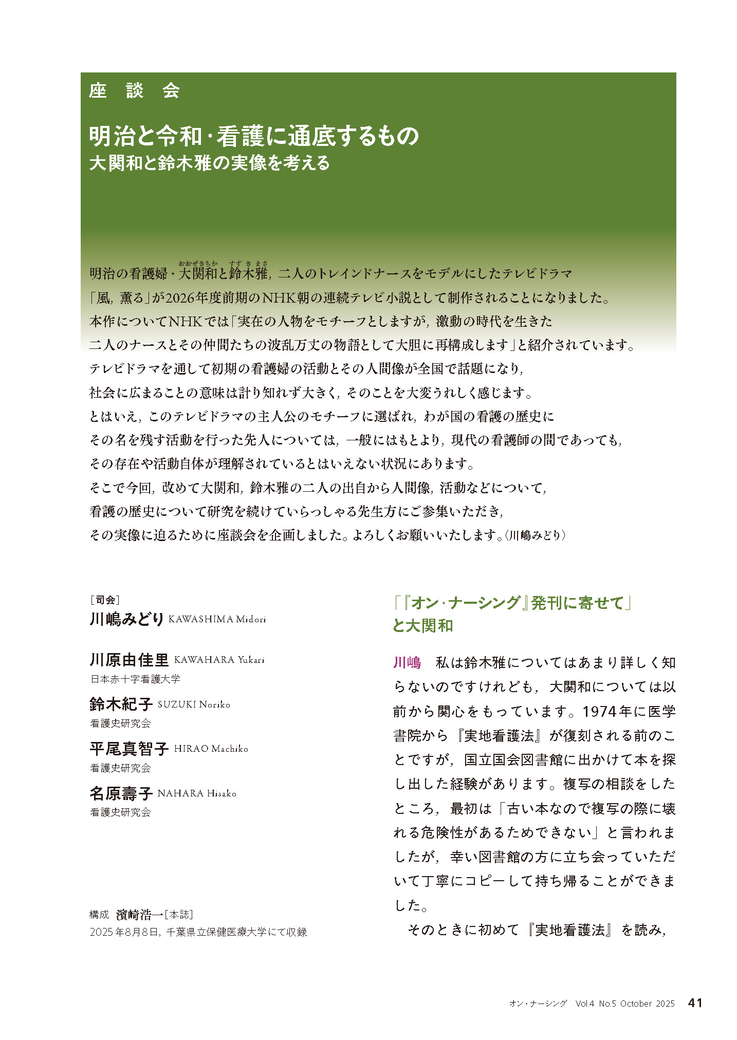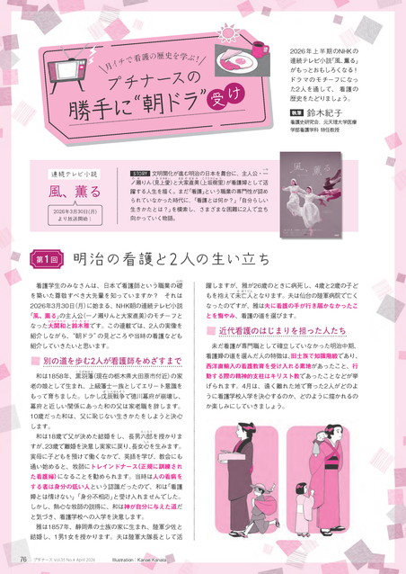 NHK2026年度前期 連続テレビ小説「風、薫る」。主人公のモデルは大関和と鈴木雅、原作は田中ひかるで、ドラマ化にあたり、大幅に改変が行われました。NHKより日本看護歴史学会に看護考証の依頼がありました。春日広美、鈴木紀子、田中幸子、名原壽子、芳賀佐和子、樋野恵子、川原由佳里のメンバーで対応しました。